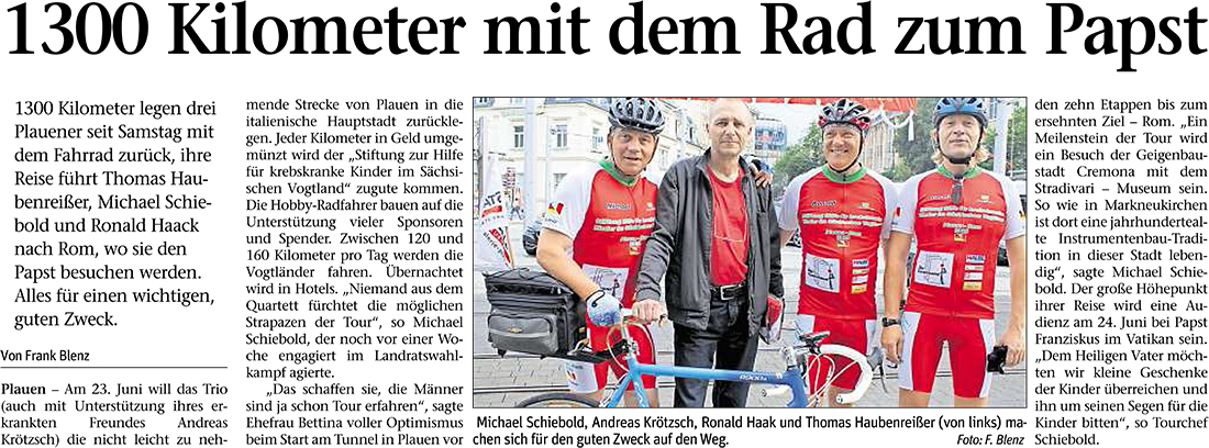 Artikel Freie Presse vom 19.06.2015 "Erfolg für Papst-Radler: Die Hälfte ist geschafft"